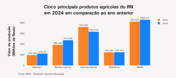 O RN também perdeu uma posição na produção de melancia, trocando o quinto pelo sexto lugar nacional com Pernambuco. Enquanto houve crescimento de 17,22% na produção pernambucana, aumentando para mais de 152 mil toneladas do fruto em 2024, a produção potiguar registrou retração de 3,7%, caindo de 147 mil toneladas em 2023 para 142 mil em 2024.