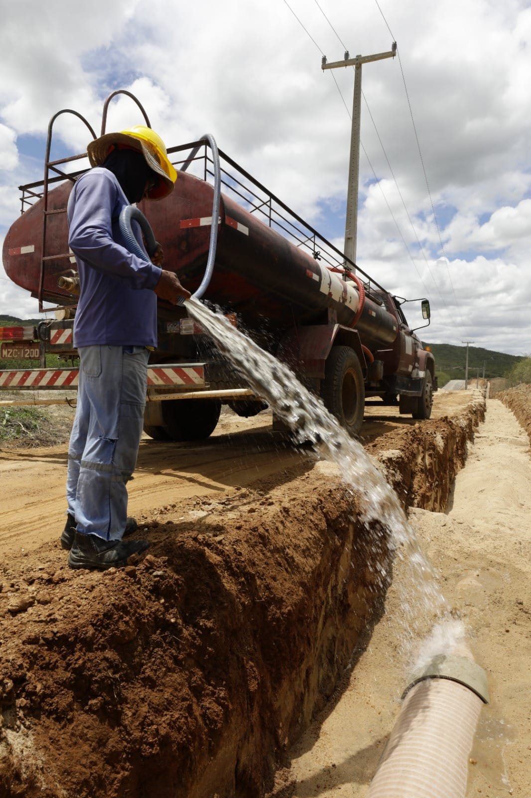 Na margem da BR-226, entre os municípios de Currais Novos e São Vicente, operários de uma empresa de construção trabalham em ritmo acelerado no assentamento de tubos do Trecho 4-Norte da Adutora do Seridó. As obras aliam o útil ao planejado. Ao mesmo tempo em que avança em mais uma etapa do projeto Seridó, o governo prepara a estrutura para abastecer os municípios de Currais Novos e Acari, caso o sistema atual entre em colapso por falta de água no Açude Dourado e no Gargalheiras.