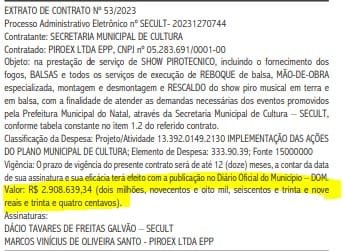Conforme o contrato firmado entre a Secretaria Municipal de Cultura e a empresa Piroex LTDA EPP, esta será responsável pela prestação de serviço de show pirotécnico, que inclui o fornecimento dos fogos de artifício, aluguel das balsas e todos os serviços de execução de reboque, mão de obra especializada, montagem e desmontagem e o rescaldo do show piro musical em terra e em balsa, com a finalidade de atender as demandas necessárias dos eventos promovidos pela Prefeitura Municipal.