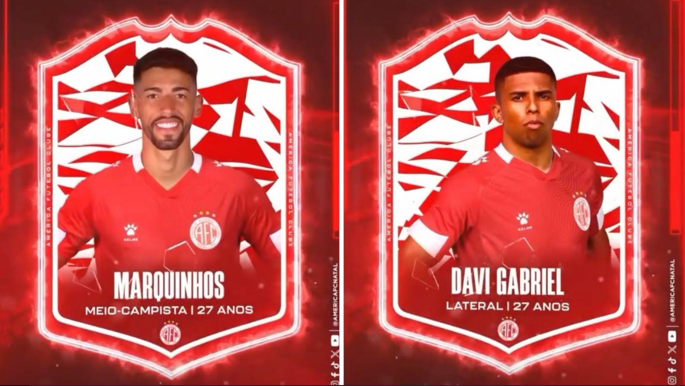 A diretoria do América SAF apresentou mais dois reforços para a temporada 2025. Foram anunciados o lateral-esquerdo Davi Gabriel, de 27 anos, que disputou as duas últimas temporadas pelo São Bernardo-SP e o meio-campista Marquinhos, de 27 anos, do União Frederiquense-RS e que pertencia ao Azuriz-PR, onde também atuou na temporada 2024.