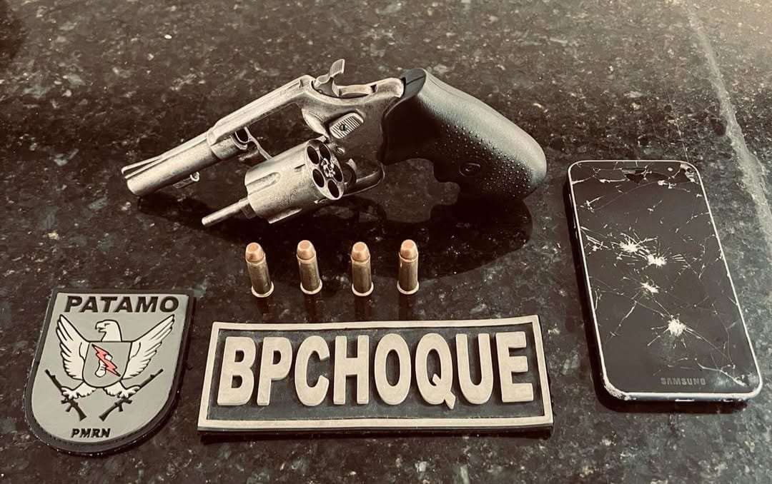 Na tarde deste domingo (08) durante patrulhamento pelo bairro das Rocas, zona leste de Natal, equipes do BPCHOQUE realizaram abordagem a um indivíduo em atitude suspeita, que ao perceber a presença das viaturas se evadiu para dentro de uma borracharia, ao realizar a busca pessoal foi encontrado um revólver calibre .38 com a numeração suprimida e 04 munições.