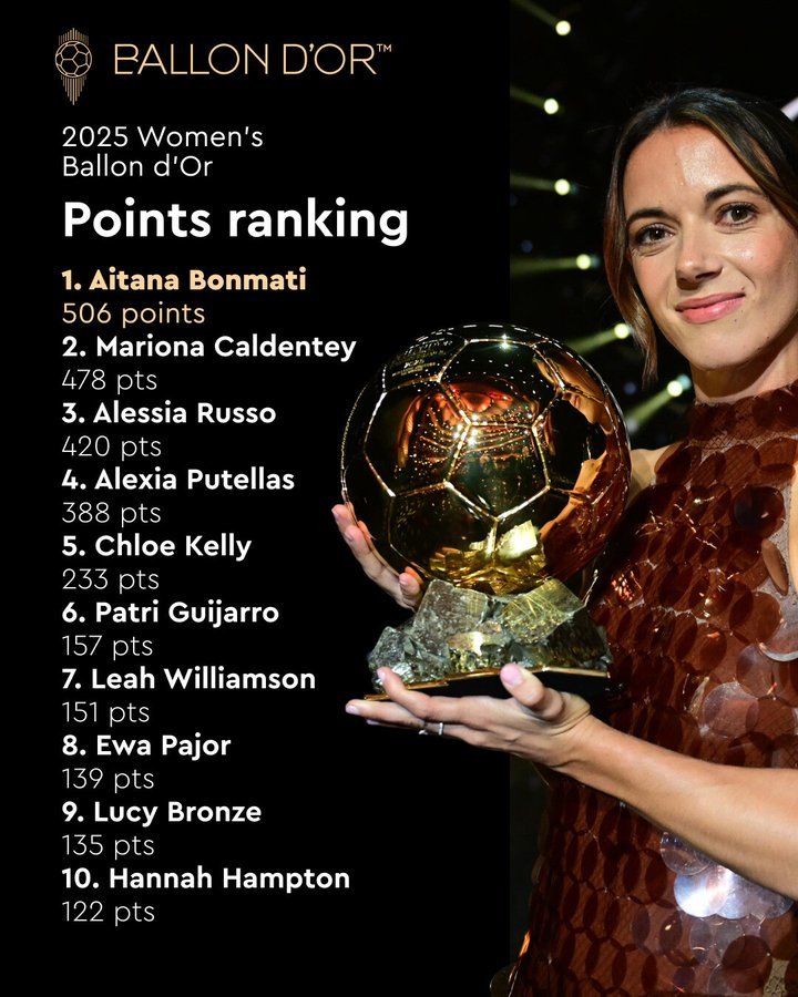 A Bola de Ouro divulgou nesta sexta-feira (26) a pontuação que consagrou os vencedores do prêmio de melhor do mundo, Aitana Bonmatí e Ousmane Dembélé.