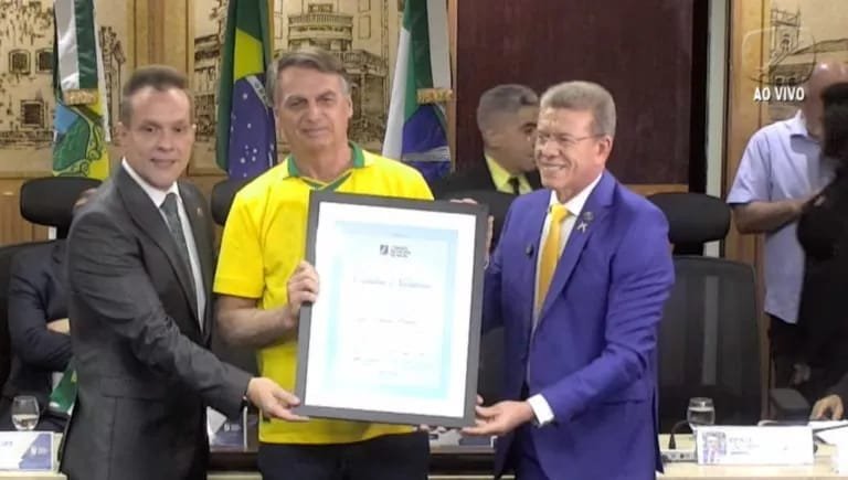 O ex-presidente Jair Bolsonaro (PL) recebeu na tarde desta quinta-feira (12) os títulos de cidadão natalense e potiguar em uma sessão solene Câmara Municipal. A cerimônia faz parte da agenda oficial de Bolsonaro no Estado e conta com a presença do prefeito Paulinho Freire (União), o senador Rogério Marinho (PL), deputados federais, deputados estaduais e vereadores.