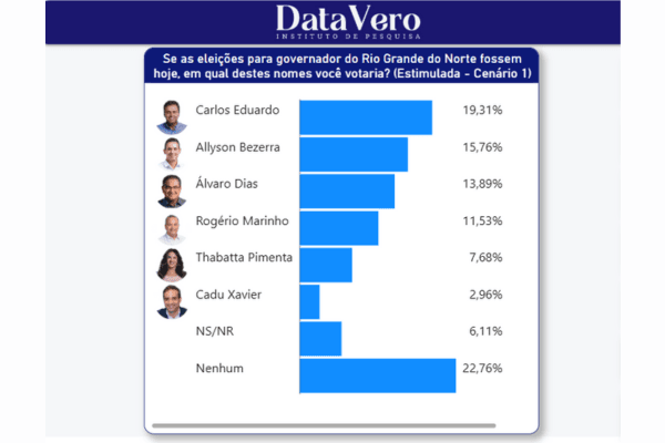Carlos Eduardo Alves soma 19,31% das intenções de voto, seguido pelo atual prefeito de Mossoró, Allyson Bezerra, com 15,76%, e por Álvaro Dias, que marca 13,89%. Na sequência aparecem o senador Rogério Marinho (PL), com 11,53%, a vereadora de Natal Thabatta Pimenta (PSOL), que alcança 7,68%, e o secretário de Estado da Fazenda, Cadu Xavier (PT), com 2,96%. Entre os eleitores ouvidos, 22,76% disseram que não votariam em nenhum dos nomes, enquanto 6,11% não souberam ou não responderam.