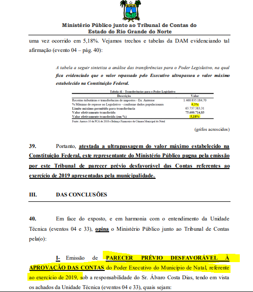No caso de Álvaro Dias, os relatórios técnicos do TCE/RN apontam problemas estruturais nas contas do Município do Natal ao longo de praticamente toda a gestão, entre 2018 e 2024.
