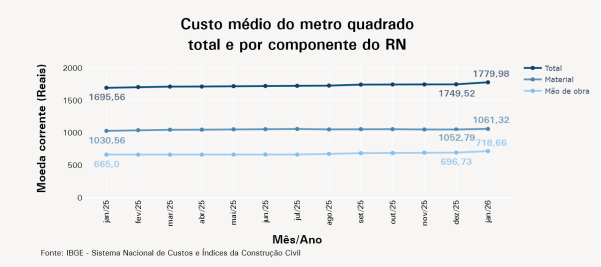 Com o resultado, o custo para construir o m² no estado saiu dos R$ 1.749,52 observados no final do ano passado para R$ 1.779,98, um aumento de R$ 30,46. Em todo o ano de 2025, o custo teve aumento de R$ 53,96. Em 12 meses, a variação foi 4,99% no RN.