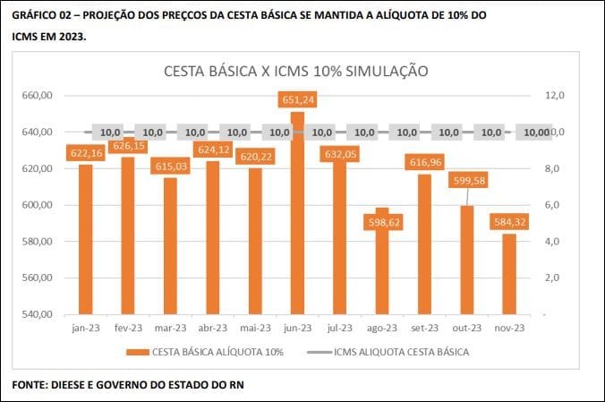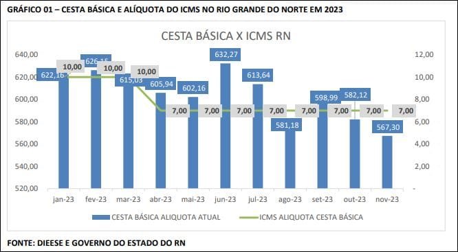 “Entre janeiro e novembro de 2023 vigoraram duas alíquotas de ICMS para a Cesta Básica no Estado do Rio Grande do Norte. A primeira de 10% estava prevista no art. 1º do Anexo V do DECRETO Nº 31.825, DE 18 DE AGOSTO DE 2022, para os produtos da cesta básica. Esta alíquota vigorou até março de 2023, quando foi o publicado o DECRETO Nº 32.542, DE 24 DE MARÇO DE 2023, que em seu art. 1º, letra “f”, prevê a redução da alíquota do ICMS para a Cesta Básica de 10% para 7%º, uma redução de três pontos percentuais, que fez com que os preços da Cesta Básica tivessem redução já partir de maio de 2023 como pode ser observado no histórico dos preços”, aponta o estudo.