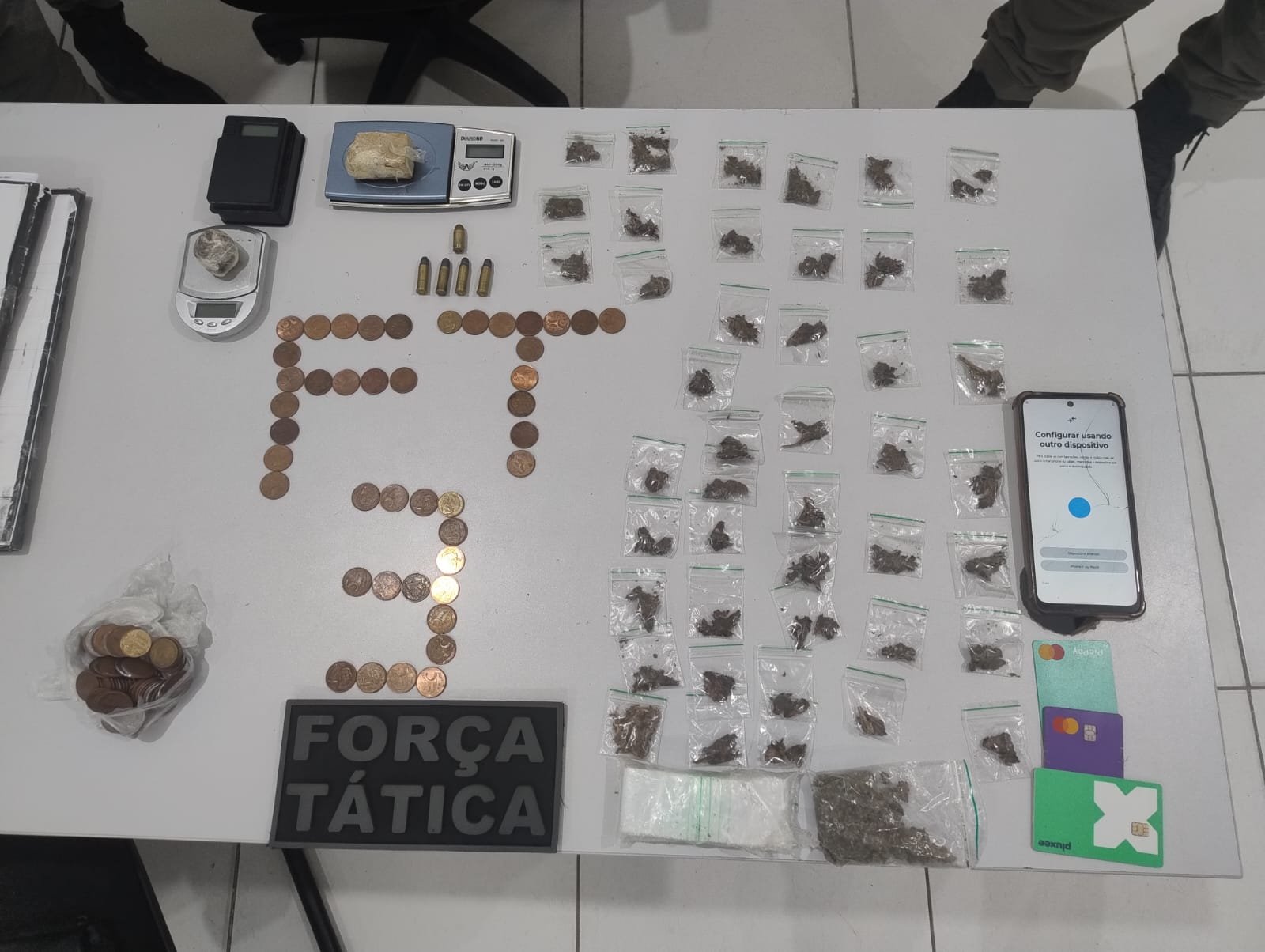 Ao realizarem a verificação no local que o homem estava, os policiais encontraram uma vasta quantidade de substâncias análogas a entorpecentes, dinheiro fracionado, munições de revólver calibre .38 e .380, além de um celular. O suspeito conseguiu se evadir.