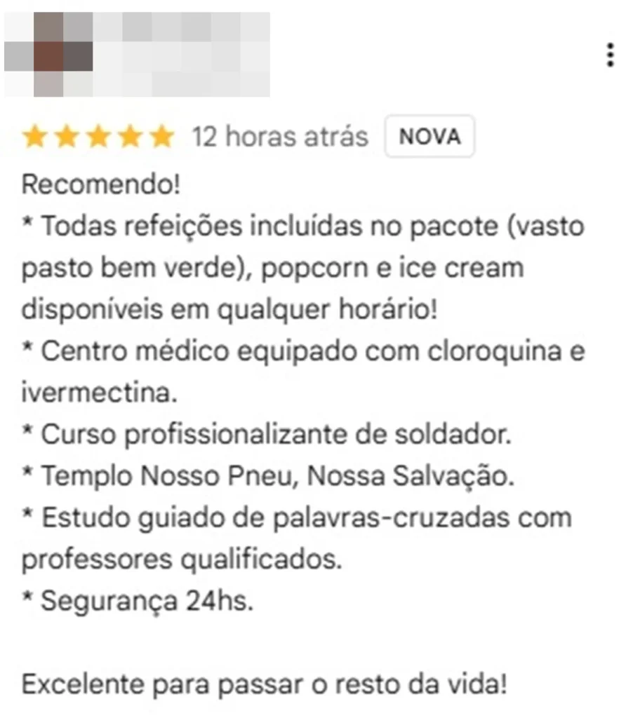 Ao clicar no “estabelecimento”, fotos de uma fachada e de uma cela com a frase “acomodação vip”aparecem. Além disso, o local fictício conta com 58 avaliações, sendo a grande maioria cinco estrelas.