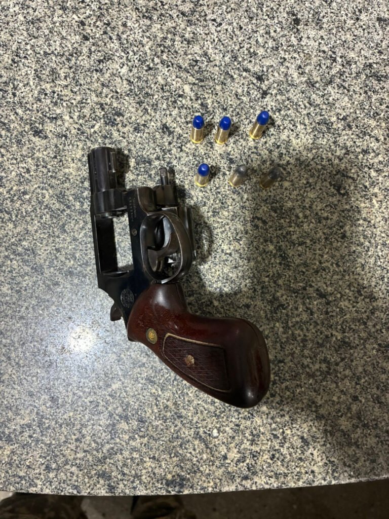 Durante a abordagem e revista pessoal, nada de ilícito foi encontrado com os ocupantes. No entanto, ao realizarem a vistoria no interior do veículo, os policiais localizaram, dentro de uma bolsa, um revólver marca Taurus, calibre .38, municiado com seis munições intactas.