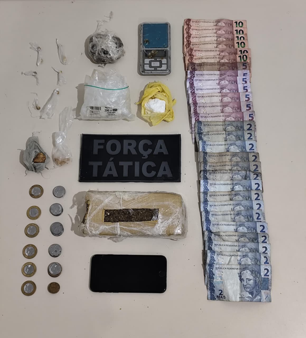 Durante patrulhamento, a equipe visualizou o suspeito em frente a uma residência com características de abandono, possivelmente utilizada para o tráfico de drogas. Ao perceber a presença policial, o indivíduo tentou fugir, pulando por casas vizinhas, sendo acompanhado e detido em seguida. Durante a fuga, ele descartou uma bolsa e um aparelho celular, que foram recuperados pelos policiais.