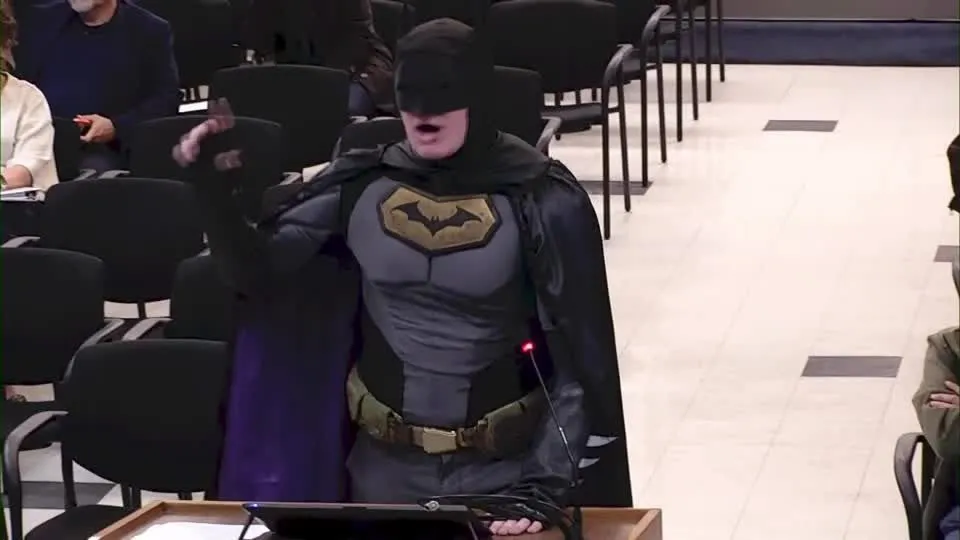 Um homem vestido de Batman apareceu em uma reunião do conselho municipal na Califórnia, exigindo que as autoridades locais não fornecessem apoio ao ICE (Serviço de Imigração e Alfândega dos Estados Unidos).