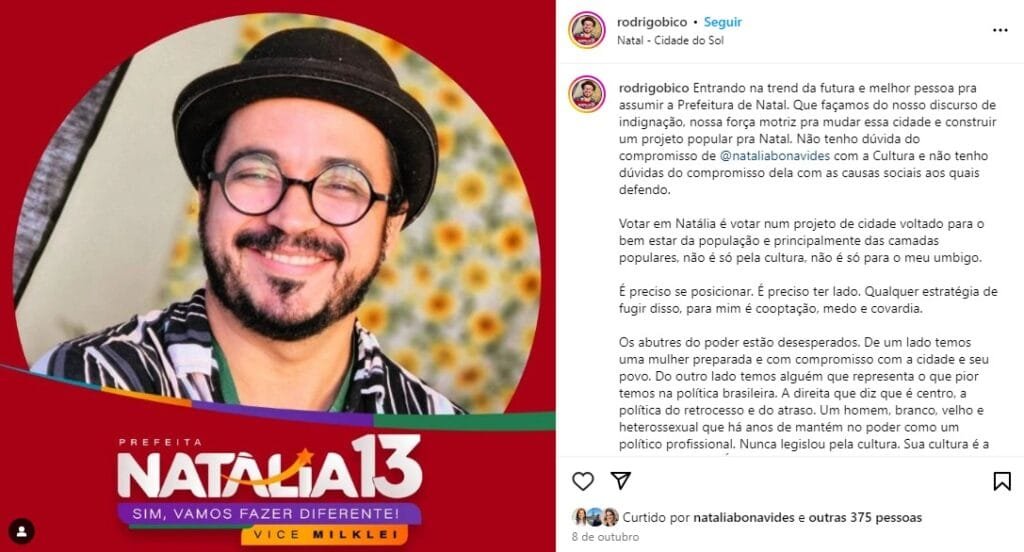 “Entrando na trend da futura e melhor pessoa pra assumir a Prefeitura de Natal. Que façamos do nosso discurso de indignação, nossa força motriz pra mudar essa cidade e construir um projeto popular pra Natal. Não tenho dúvida do compromisso de @nataliabonavides com a Cultura e não tenho dúvidas do compromisso dela com as causas sociais aos quais defendo.