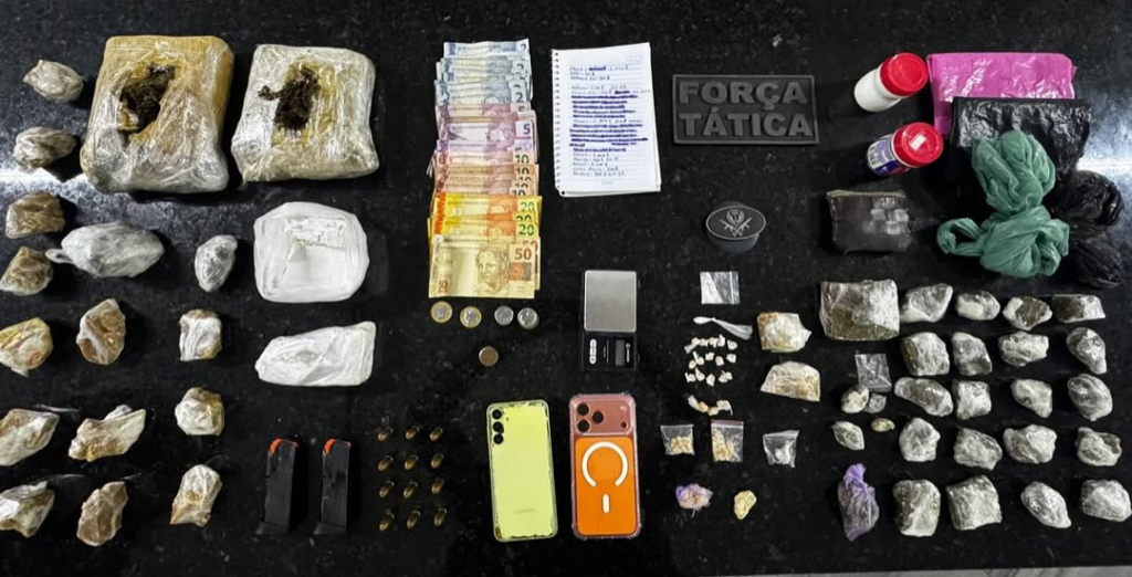 Os policiais a acompanharam até uma casa não habitada, onde ela foi abordada. Em sua posse foram encontrados mais entorpecentes, munições, carregadores de pistola, celulares, dinheiro e um caderno com anotações do tráfico.