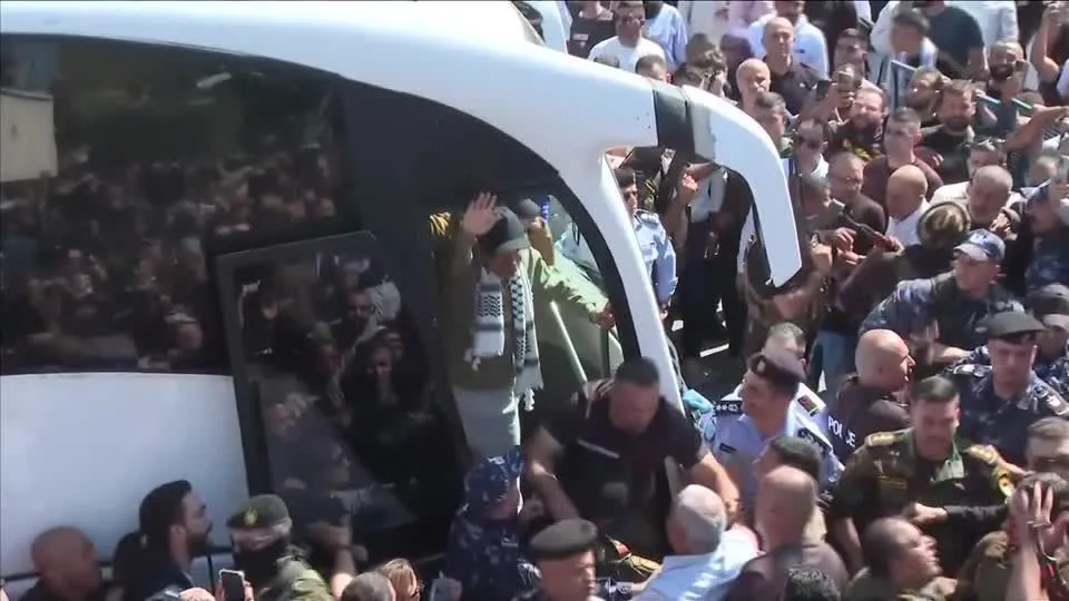 Dois ônibus transportando prisioneiros palestinos libertados de prisões israelenses chegaram na cidade de Ramallah na segunda-feira (13), como parte do acordo de cessar-fogo mediado pelos Estados Unidos.