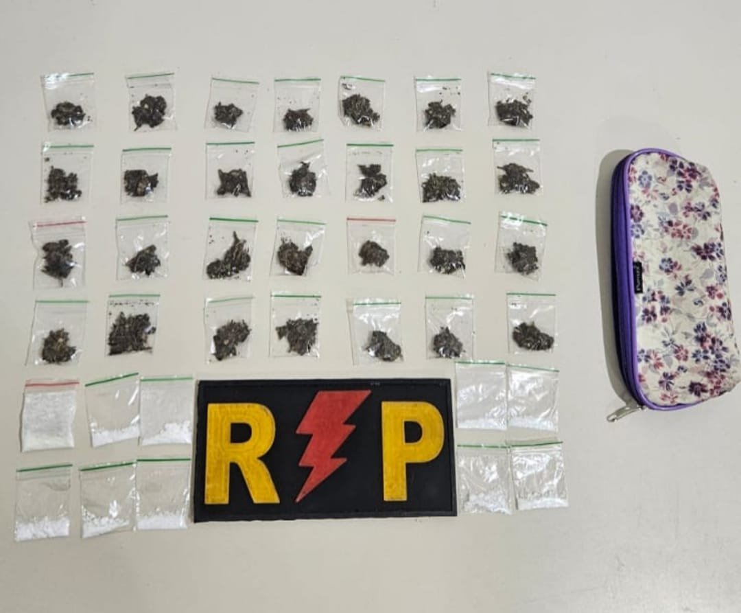 A equipe realizava patrulhamento quando recebeu informações de populares de que um indivíduo, estaria comercializando entorpecentes na região. Ao avistar a viatura policial, o suspeito tentou correr para dentro de uma residência, momento em que descartou um estojo escolar de cores roxa e branca.
