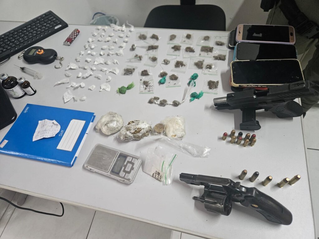No decorrer das buscas, foram apreendidas duas armas de fogo: uma pistola calibre .380 e um revólver calibre .38, ambos municiados.