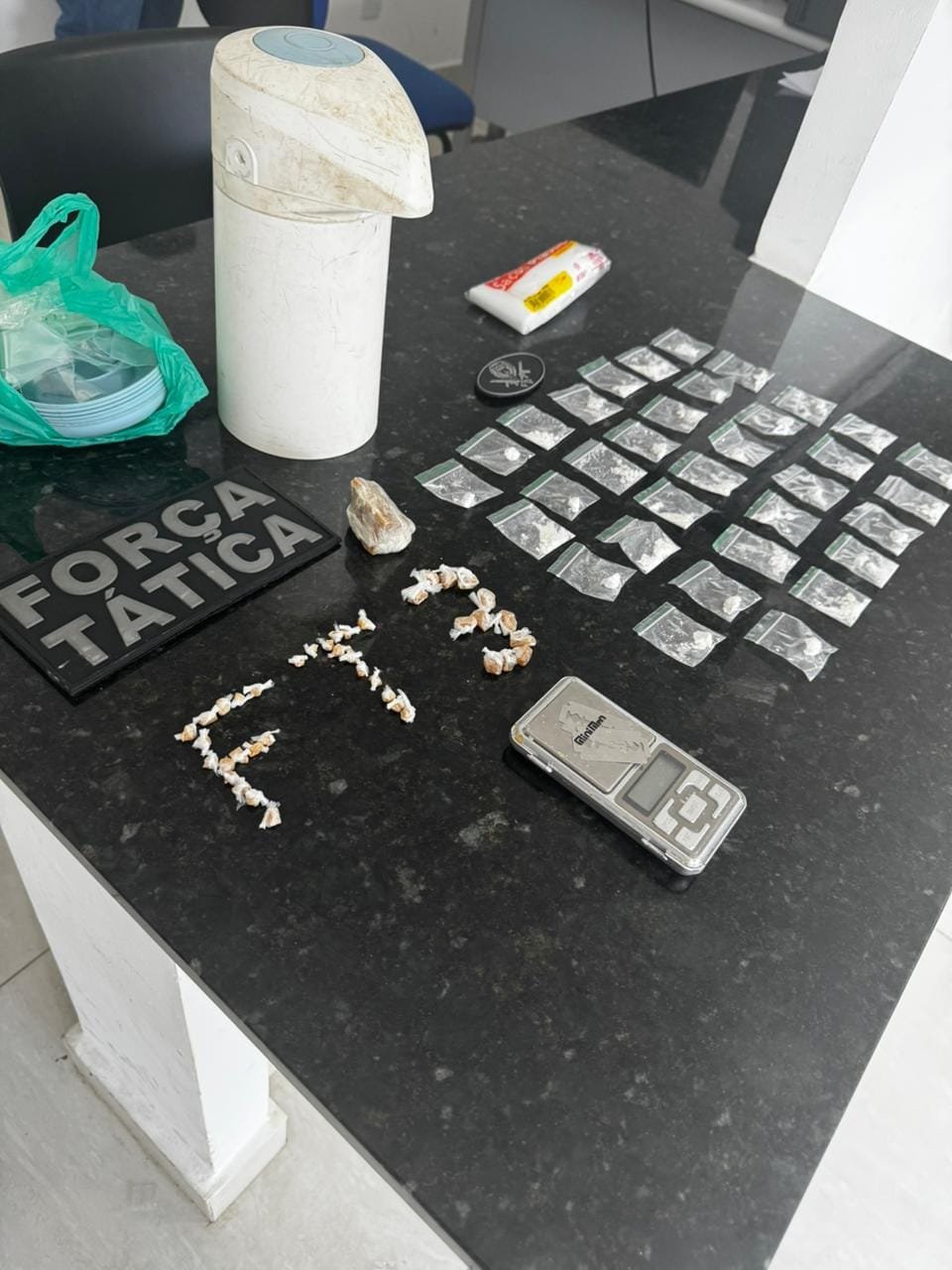 Ao analisarem o recipiente, os policiais constataram que se tratava, na realidade, de um compartimento adaptado com fundo falso. No interior da garrafa foram encontrados entorpecentes análogos a crack e cocaína, além de uma balança de precisão e diversos sacos plásticos utilizados para o fracionamento e comercialização das drogas.