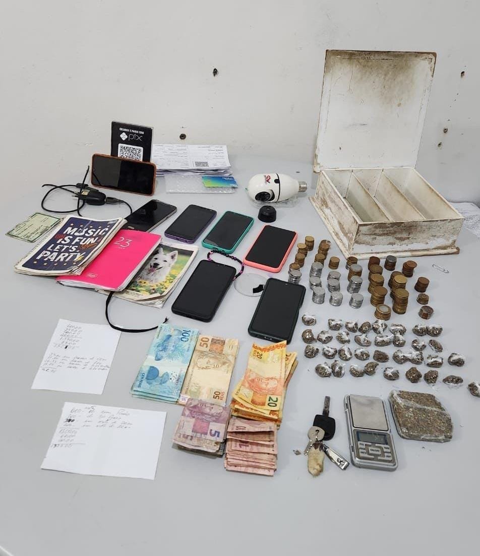 Na ocasião, foram apreendidos aparelhos celulares, drogas, cadernos de anotação, balança de precisão, apetrechos utilizados para a comercialização de drogas e outros objetos. De acordo com informações, um homem, investigado pelo crime de tráfico de entorpecentes e apontado como o responsável por um ponto de comercialização de drogas, onde funcionava um disque-droga, vendia a mercadoria através do PIX e QR-code personalizado, além de disponibilizar o serviço de entrega domiciliar.