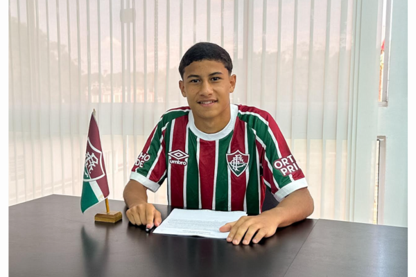 O meia potiguar Carlos Miguel, de apenas 16 anos, assinou seu primeiro contrato profissional com o Fluminense. O novo acordo acertado entre as partes vai até o fim de maio de 2028. Natural de São Gonçalo do Amarante, a nova promessa do futebol brasileiro defende o tricolor desde 2019, quando tinha nove anos.