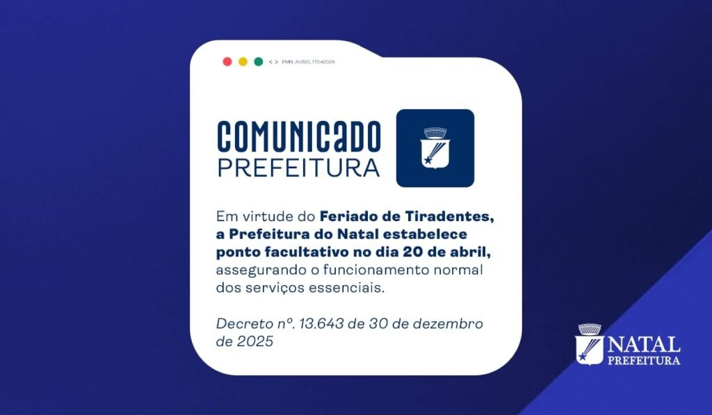 A Prefeitura do Natal informa que a próxima segunda-feira (20), véspera do feriado de Tiradentes, será ponto facultativo nos órgãos e entidades da Administração Pública Municipal.