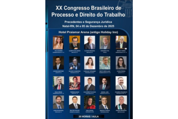 O XX Congresso Brasileiro de Processo e Direito do Trabalho ocorrerá em Natal, RN, nos dias 4 e 5 de dezembro de 2025, no Hotel Praiamar Arena (antigo Holiday Inn). O evento debaterá temas como precedentes, segurança jurídica, e temas atuais da Justiça do Trabalho, com a participação de especialistas, professores, pesquisadores e demais profissionais do Direito, promovendo reflexões sobre os desafios e as transformações recentes da Justiça do Trabalho no Brasil. As inscrições já estão abertas e podem ser realizadas pelo site.