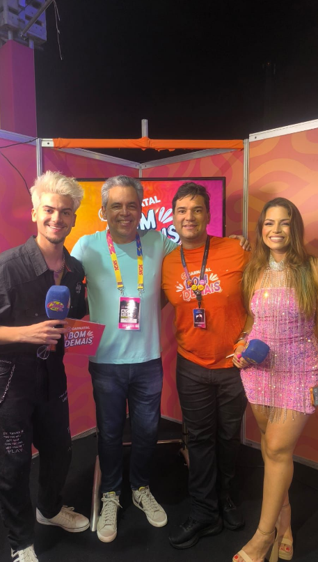 O CEO da FM e TV Clube Natal Amaury Veríssimo Jr. recebendo Felinto Filho, da Clap, no camarote da Clube comemora primeira transmissão ao vivo do Carnatal. Show!