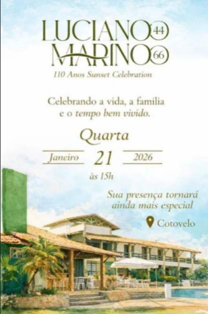 O empresário Marino Eugênio e o filho Luciano Almeida, leia-se Olimpo Recepções, são os anfitriões de mais um evento chique que vai agitar o verão 2026 do litoral Sul potiguar. Os dois convidam para hoje (21), para festa 110 anos Sunset Celebration, uma forma de pai, que completa 66 anos e filho, que chega aos 44 anos, comemorarem a vida juntos ao lado dos convidados. A partir das 15h na praia de Cotovelo.