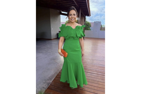 Maria do Carmo Azevedo deslumbrante em um casamento em São Miguel do Gostoso, num design exclusivo de Juraci Lira, revelando elegância, em um modelo que valorizou sua silhueta. O destaque da peça ficou no decote ombro a ombro, que trouxe delicadeza e feminilidade ao look. O acabamento adornado com origamis deu um toque artístico à criação. A combinação de linhas elegantes e detalhes cuidadosamente trabalhados mostrou a assinatura marcante do estilista. Foi uma escolha certeira de Maria do Carmo para celebrar o amor em grande estilo.