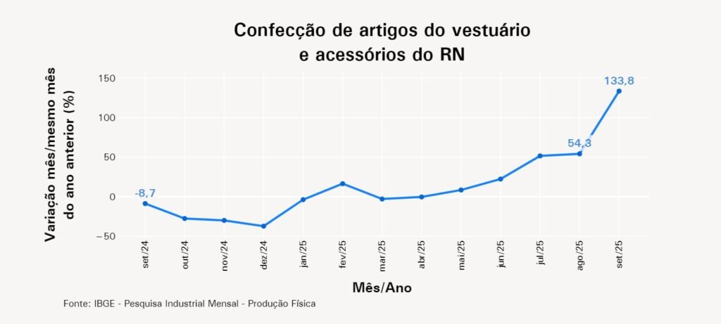 O desempenho da indústria no RN foi puxado pela aceleração das atividades de confecção de artigos do vestuário e acessórios, que registrou um aumento de 133,8% no período.