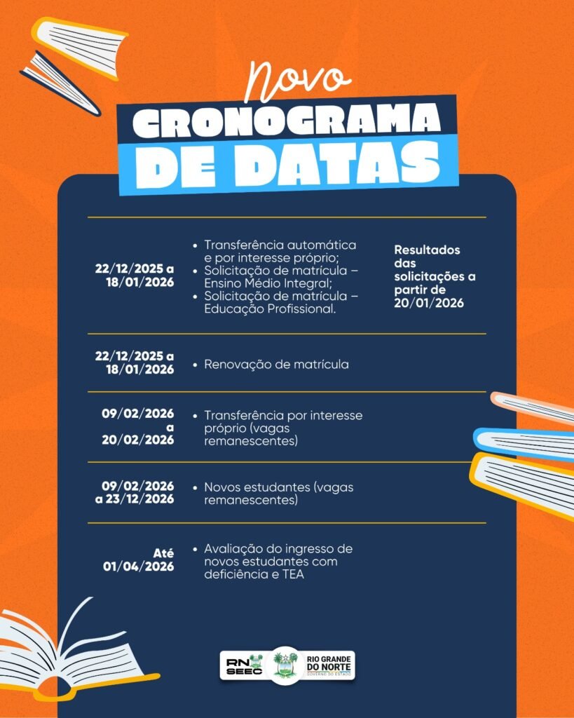 A rede estadual de ensino abriu o novo ciclo de matrículas para o ano letivo de 2026, oferecendo mais de 200 mil vagas entre renovações, transferências e novos ingressos. O procedimento deve ser realizado pelo Sistema Integrado de Gestão da Educação (SIGEduc), no endereço eletrônico www.sigeduc.rn.gov.br.