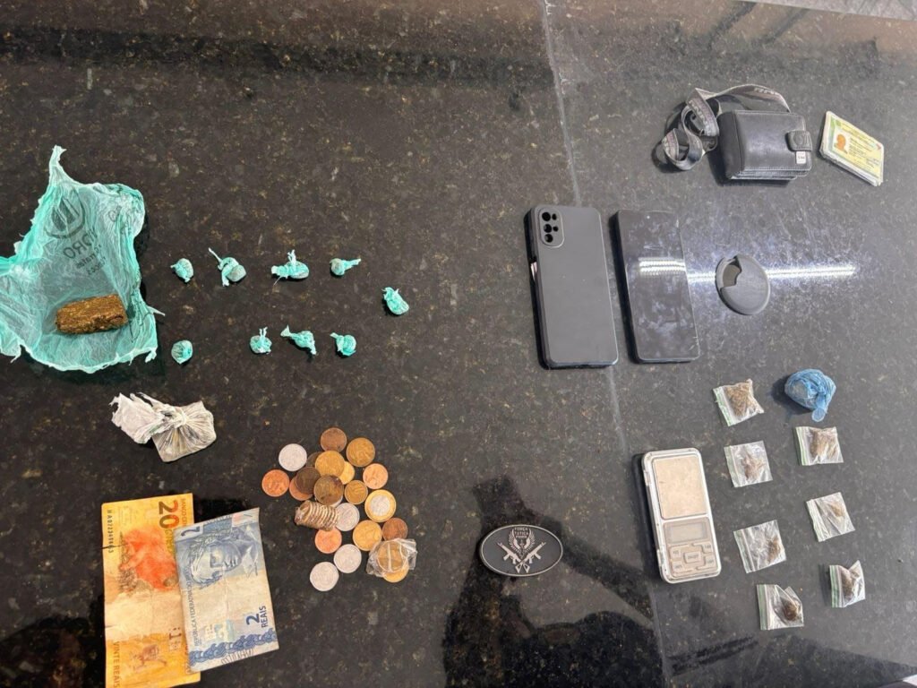 Durante a ação, a equipe tática realizou a abordagem aos suspeitos e, na busca pessoal, encontrou entorpecentes e materiais utilizados na atividade criminosa.
