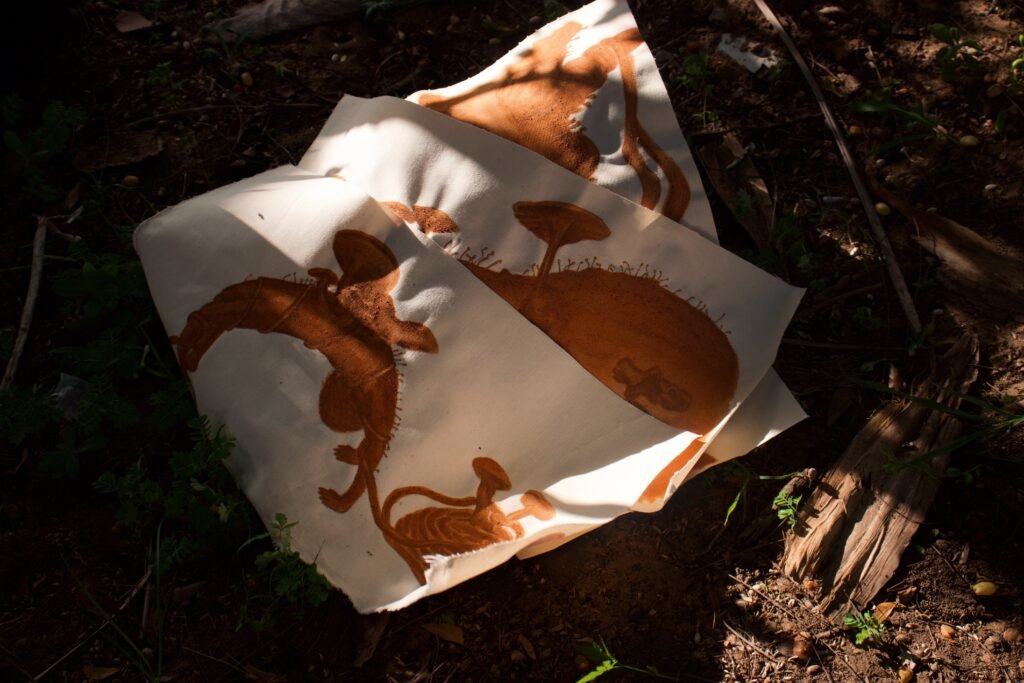 Essa recusa à separação entre humano e natureza se materializa literalmente em sua produção: o artista fabrica as próprias tintas vegetais — com urucum, couve-folha e açafrão — e as geotintas, elaboradas a partir de solos coletados em diferentes territórios. Com esses materiais, assina séries como “Entre a Quebra e o Respiro” e “Abaixo do Chão, Presenças Inquietantes”, que reúnem pinturas, desenhos e gravuras onde pedras coladas e carvão vegetal dividem espaço com as tintas da terra. A instalação “Atravessar Musgo” completa a mostra com caixas de feira, papel jornal, areia e mudas de PANCs (Plantas Alimentícias Não Convencionais), uma experiência sensorial e tátil que convida o visitante ao contato direto com a vegetação viva.