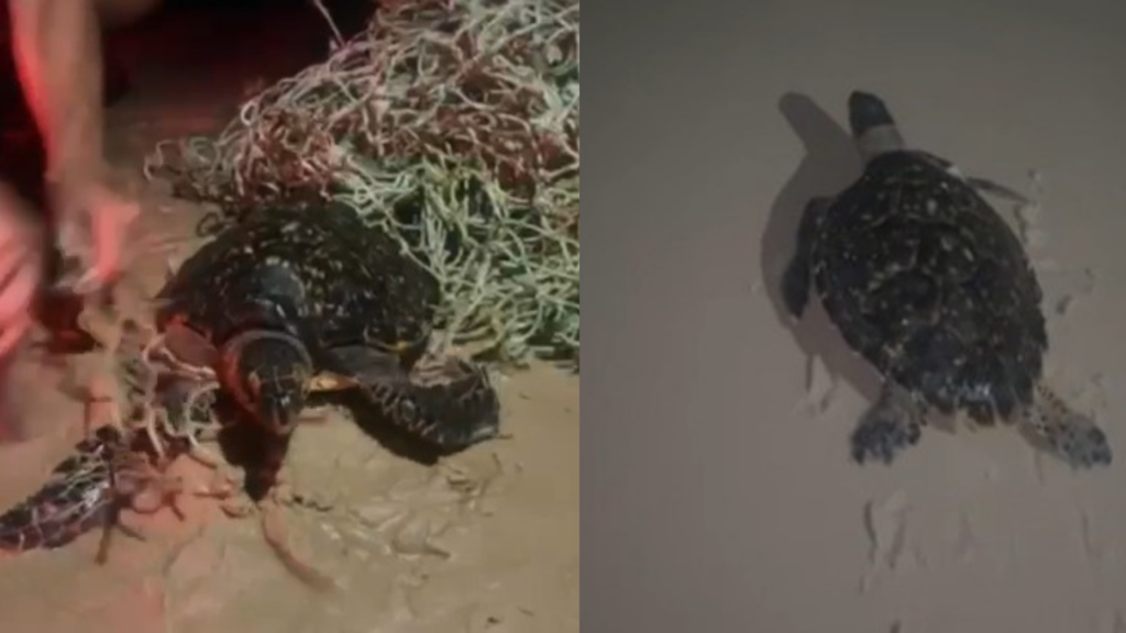 Após o resgate, a tartaruga foi devolvida ao mar em um ponto considerado seguro, distante de redes e embarcações.