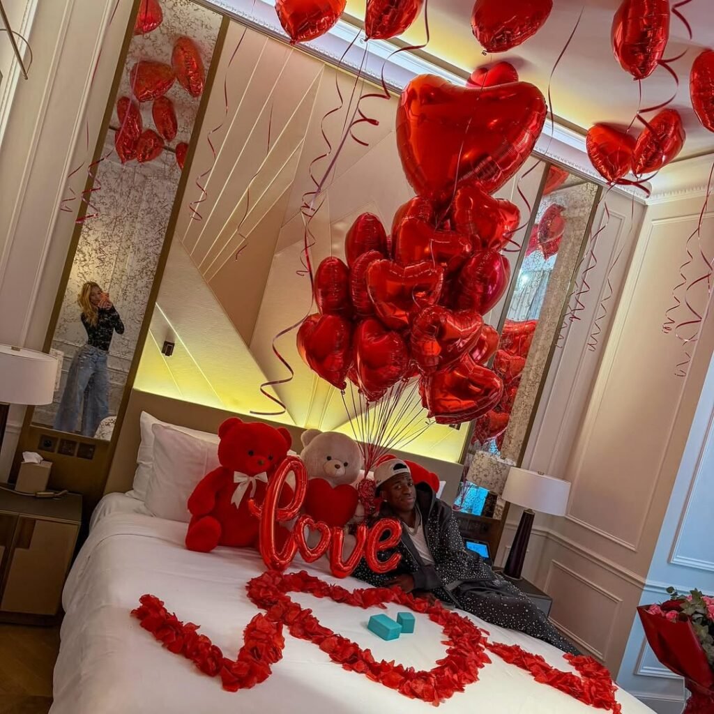 “V❤️V”, diz a legenda do carrossel de fotos do casal, que traz imagens da dupla em um quarto repleto de balões de coração, pétalas de rosa e ursos de pelúcia.